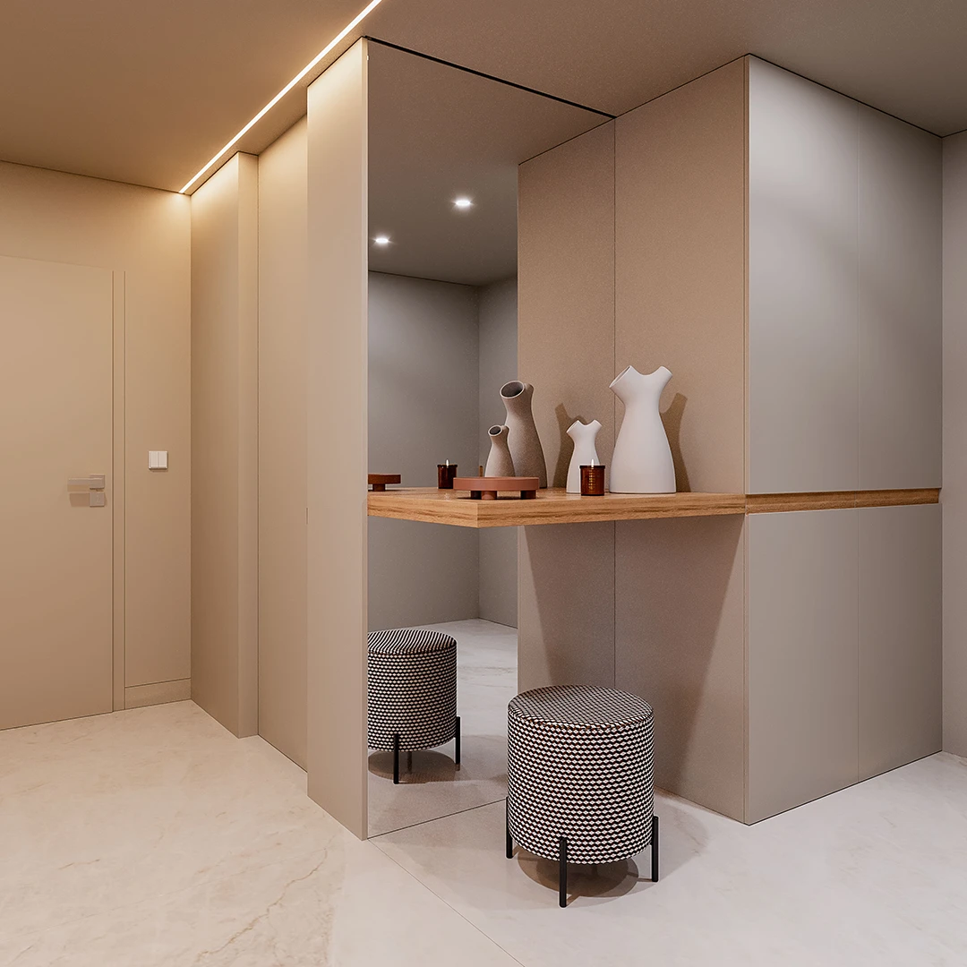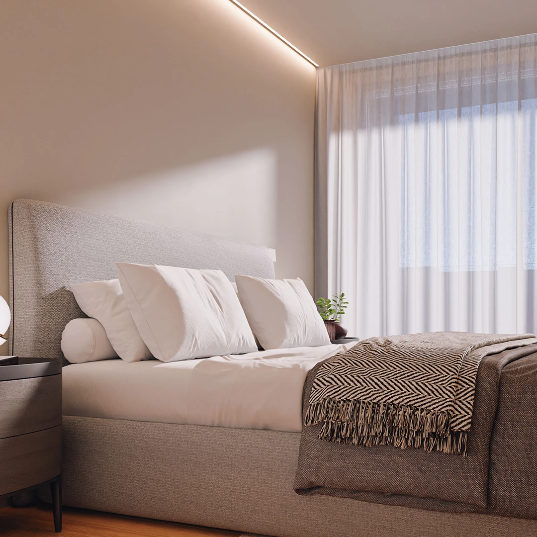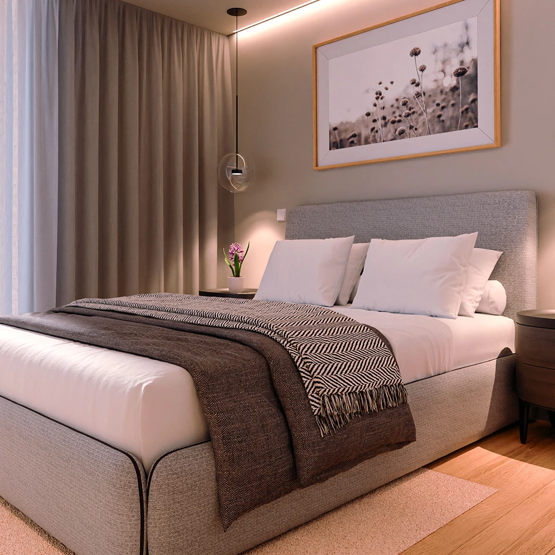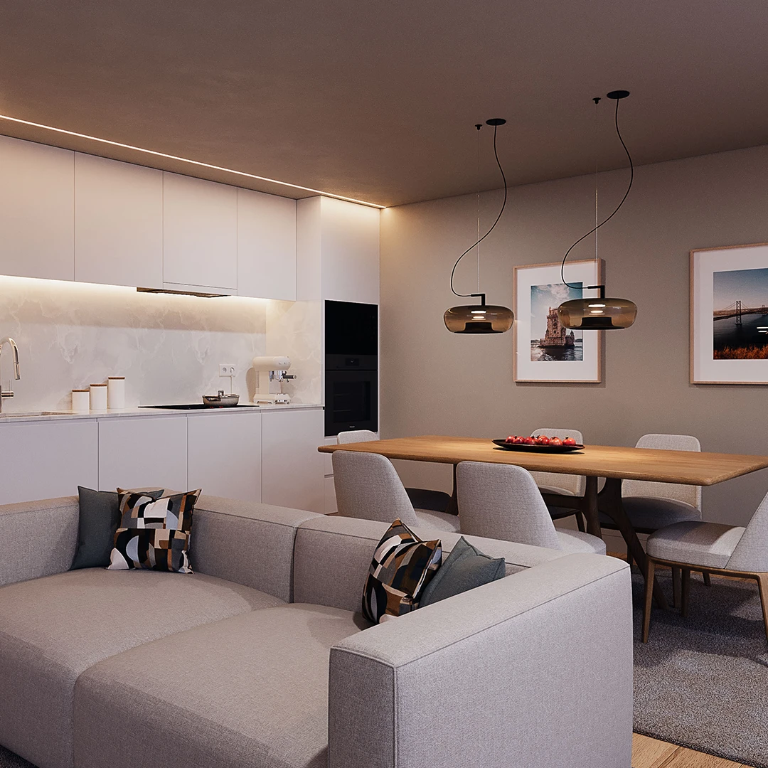 Os apartamentos constroem-se a partir da escala do corpo e do ritmo da cidade. A luz percorre os espaços ao longo do dia, desenhando atmosferas mutáveis, enquanto os materiais estabelecem um equilíbrio subtil entre memória e contemporaneidade. Nada é excessivo; tudo é pensado para durar.